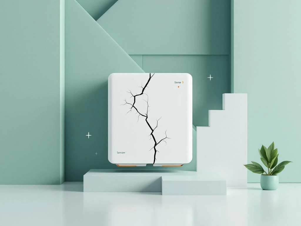 Witte thuisbatterij met oranje waarschuwingssymbolen voor brandveiligheid op groene gradiënt achtergrond